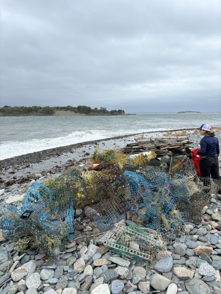 The next day, teams were sent only to Lovell’s, Calf, and Great Brewster Islands because of the growing surf. I landed on Calf Island with a small group to move debris that had been collected to the established staging areas. We were able to complete the staging before all teams were called off the islands after only a half day of work. By Friday the winds and surf allowed us to only approach Lovell’s Island so I took a group ashore there to finish staging debris while the other volunteers sorted debris in Hull. We were able to collect a sizable number of lobster traps that hadn’t been removed yet and staged them with a pile of treated wood for later pickup. At this point, the weeklong cleanup was complete and debris that had been collected in Hull was ready to be sorted, tallied, and weighed. This was completed in pelting wind and rain with a group of volunteers who didn’t stop smiling the entire time.