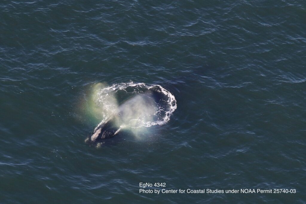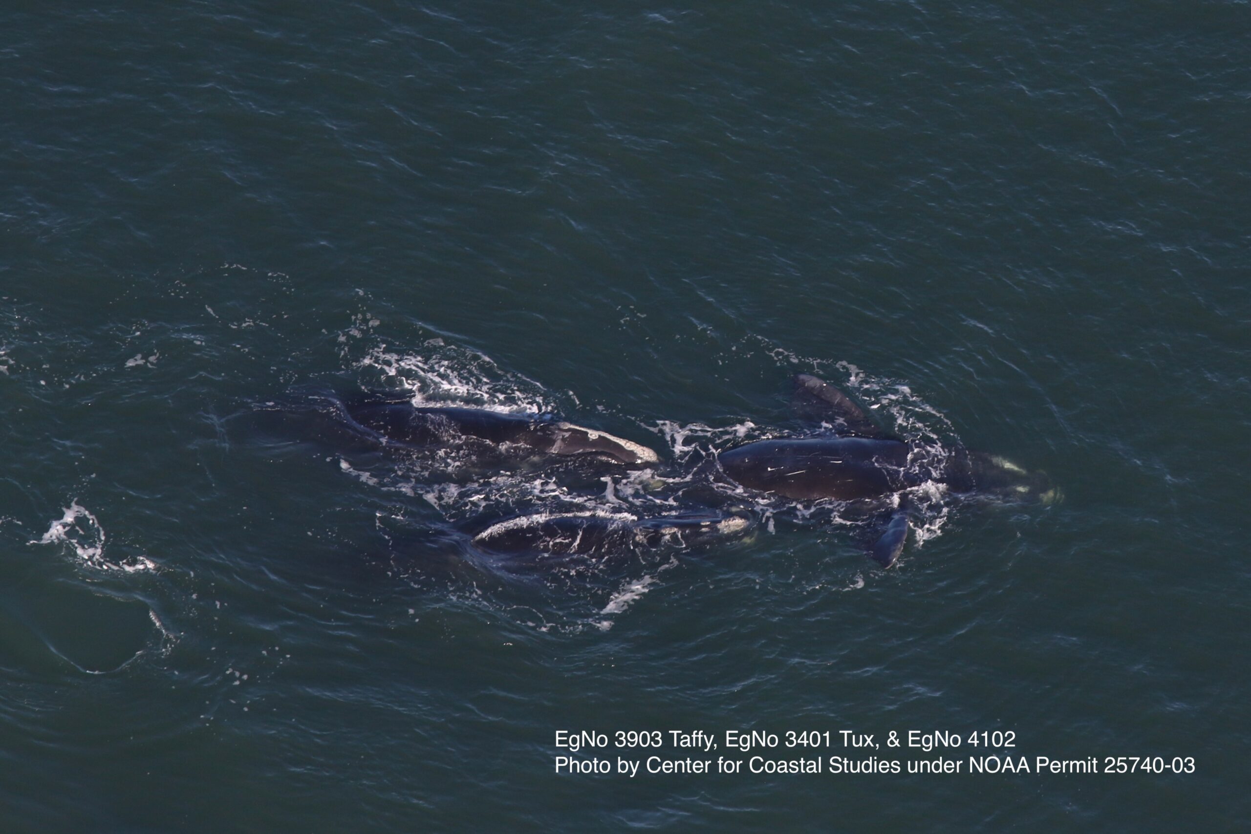 “Six of these individuals were engaged in a Surface Active Group (SAG), a social behavior wherein two or more individuals physically interact at the surface and which can include mating behaviors. In this instance, there was a 16-year-old focal female, identified as #3903 “Taffy,” accompanied by five males: including #3714 “Sawtooth,” #1150 “Gemini,” #3401 “Tux,” #4102 and #4990,” said Ryan Schosberg, Aerial Observer and Data/Photo Manager for the CCS Right Whale Ecology Program.