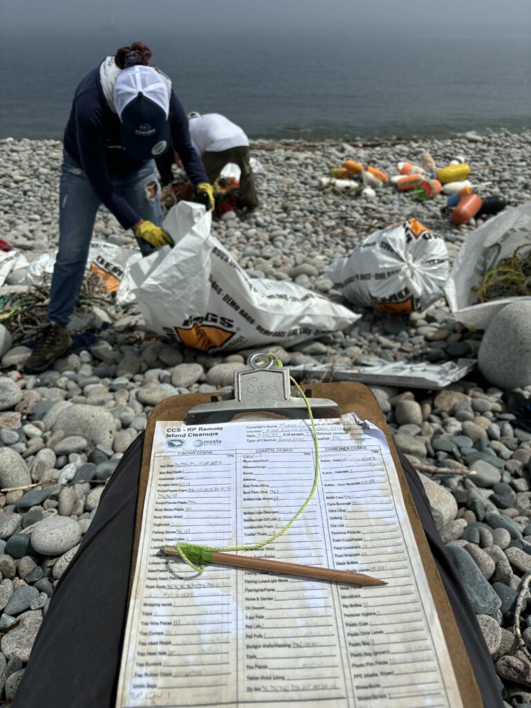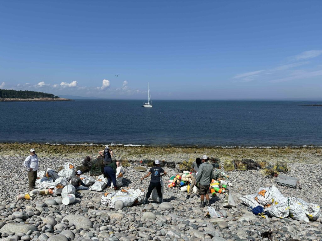 The first day involved sailing from her mooring in Rockland, Maine to Long Island 30 miles to the east. The trip had a steady tailwind and we easily held 6-8 knots for a majority of the day. We arrived at the north cove of Frenchboro, Long Island that sits protected from the southerly wind by an isthmus; and anchored in time to go ashore for a reconnaissance of what the next day’s cleanup would entail. We split into two teams the next day to cover both sides of the isthmus and continued to document and bag debris for around 7 hours. Each item found is tallied on a data sheet and then at the end of the cleanup all debris is also weighed. Trevor Herrick, the regional stewardship manager for the Mount Desert Island region of the Maine Coast Heritage Trust, brought his vessel and a skiff into the cove the next day and we were able to off-load two-thirds of the debris for disposal. The debris he was unable to take was staged so that he could return a few days later. In total from Frenchboro, Long Island we removed 2343 pounds of debris, including 413 single use beverage bottles, 365 rope knots, 310 foam buoys, and 142 zip ties.