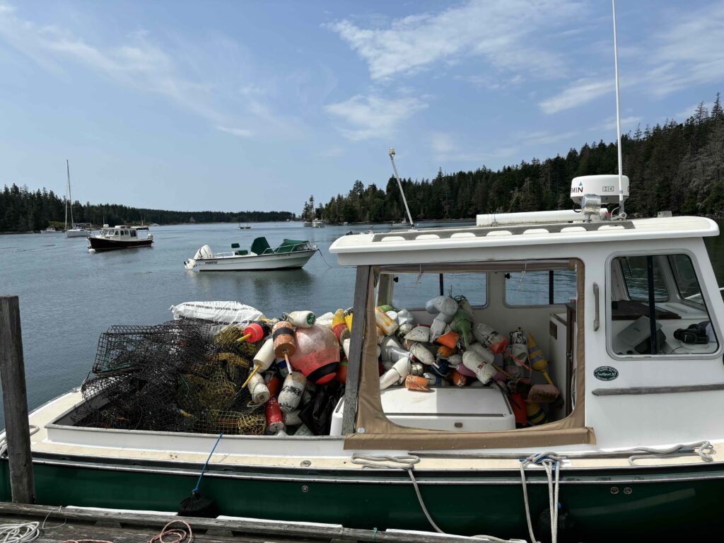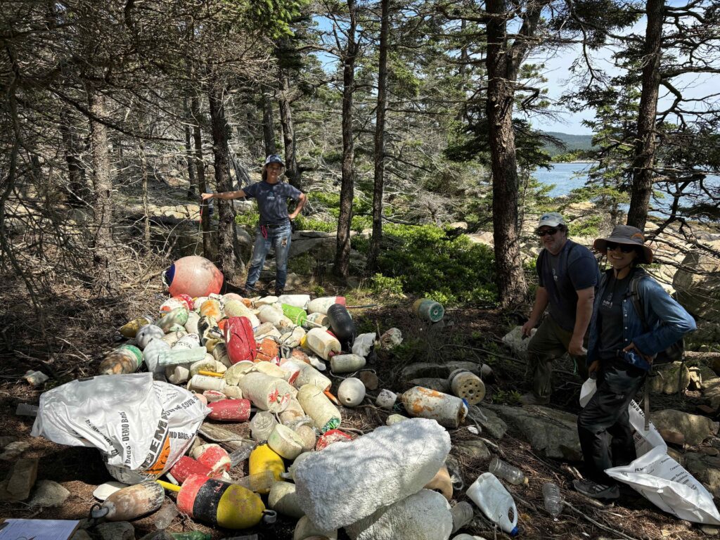 Leaving Frenchboro we sailed west around the north side of Isle au Haut and anchored off the north shore of Kimball Island for the next two nights. The sail that day and the overall area of Kimball Island just south of Stonington, Maine really gives a feel for how many islands are in Penobscot Bay with rounded granite seemingly rolling out of the ocean in any direction that one looks. We landed the following day in the northwest cove of Kimball and hiked across the island to the south-facing Marsh Cove, meeting the only resident of the island, Bob, along the way. He showed us the hot spots for debris in the cove and we had our work for the morning cut out for us. Bob was able to work with the Captain of the American Promise to off-load the debris we found using his skiff and vessel timed with the high tide in the Cove. We then moved to the southern facing cliffs of Kimball to find the woods absolutely overwhelmed with debris, most of which was made up of foam buoys. Once debris was staged, we had a very sporty offloading of the debris to an anchored skiff, using a volunteer’s paddleboard and multiple people in the water (myself included). At the end of this very long day, Bob invited us to his house, which is set on the highest point of Kimball overlooking Isle au Haut, for an outdoor pizza party with his family and friends. We all took turns cooking pizzas in the brick pizza oven and had a delightful reprieve as the nearly full moon rose over the Isle hills. I was really struck by the overwhelming sense of community in this very remote area of the Gulf of Maine and it’s a sense that I am still feeling and want to cultivate now that I have returned to Boston. The next morning we returned to Bob’s dock to weigh everything we had collected, load up his boat and another local fisherman Jason’s boat and take it north to Stonington for disposal. In total from Kimball Island we removed 1881 pounds of debris, including 1038 foam buoys and 459 single use beverage bottles.