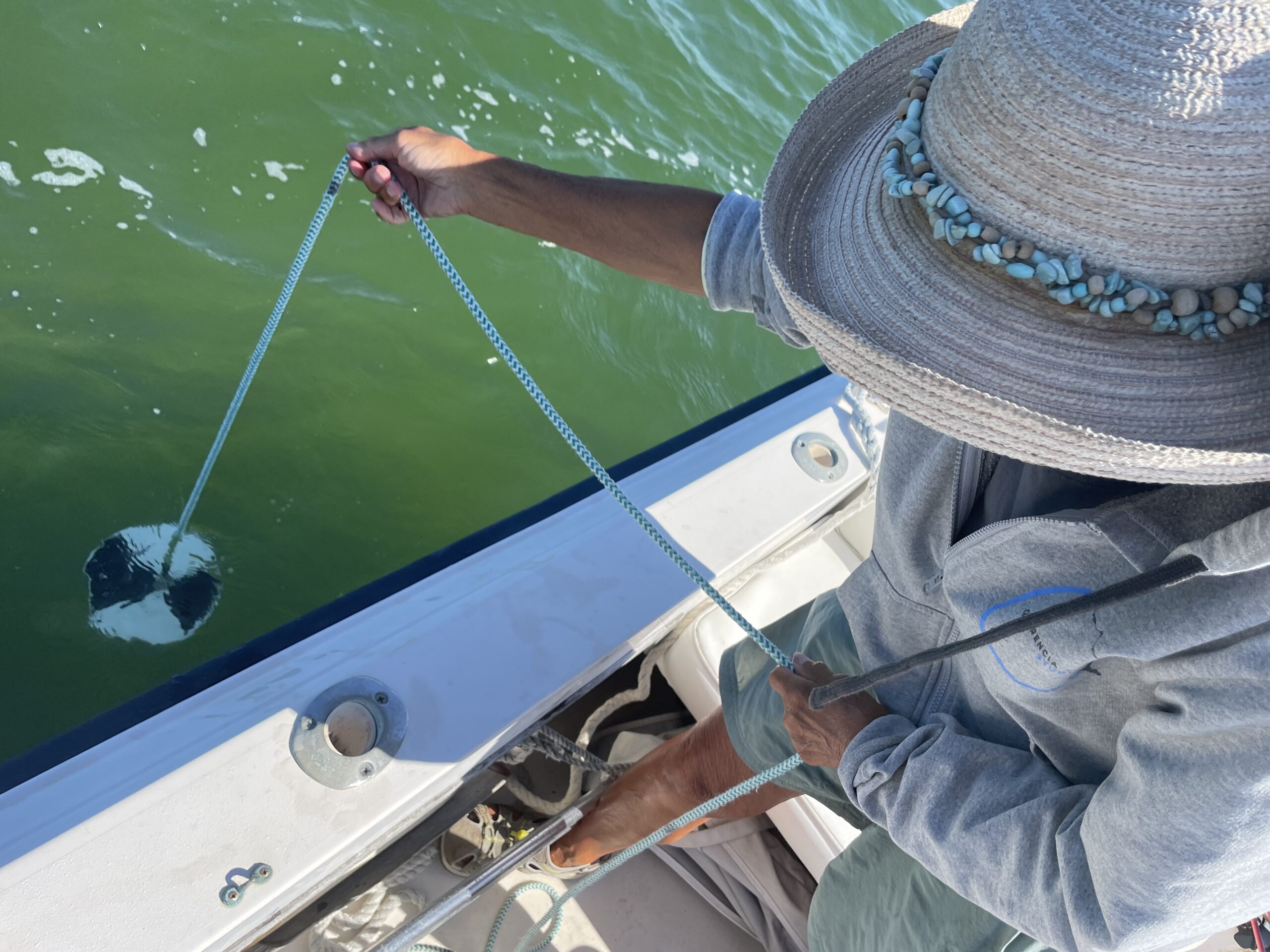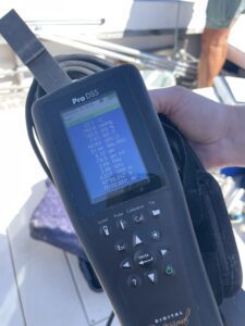 On the port side, Jenn deploys the YSI, an electronic sensor that measures salinity, dissolved oxygen, and temperature. That done, she sets up a Niskin bottle and lowers it over the side. When it has descended to two meters, she releases a lead weight which closes the tube, collecting the water sample at the desired depth. Jenn pulls the sample to the surface, where Barbara is waiting with an empty bottle.
