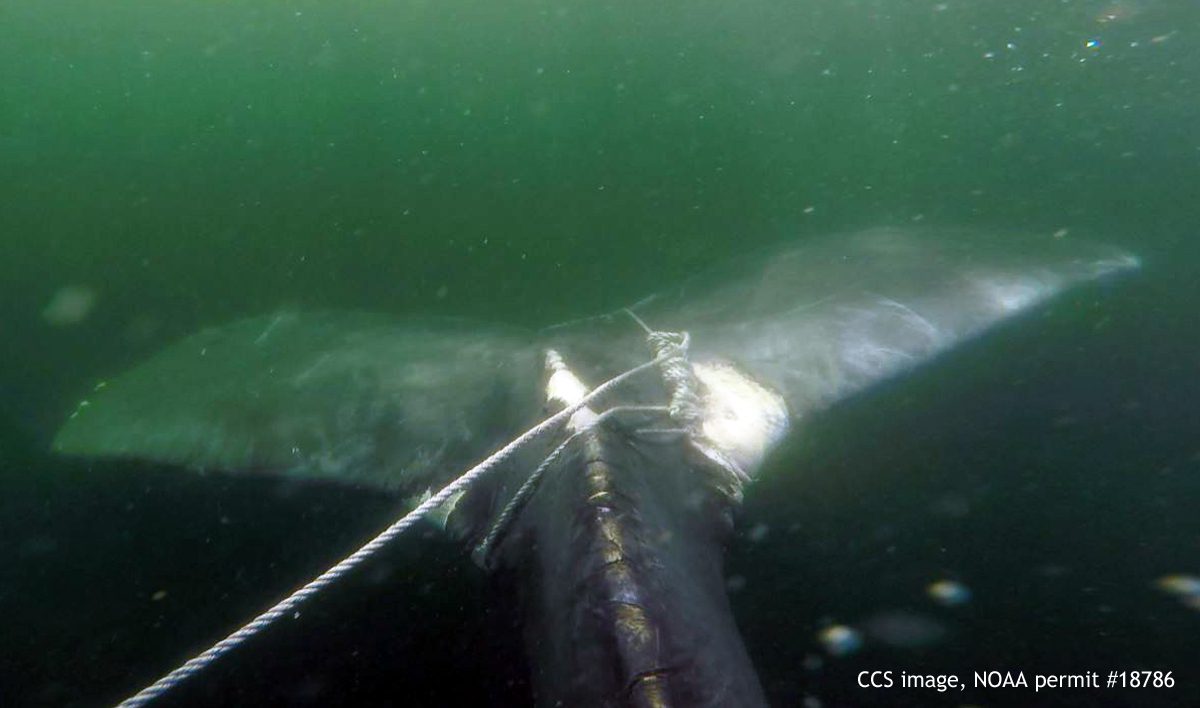 The whale had rope wrapped around the base of its tail, leading to fishing gear at the sea floor. CCS image, NOAA permit #18786